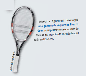 Babolat a également développé une gamme de raquettes French Open, pour permettre aux joueurs de Club de partager toute l’année l’esprit du Grand Chelem.